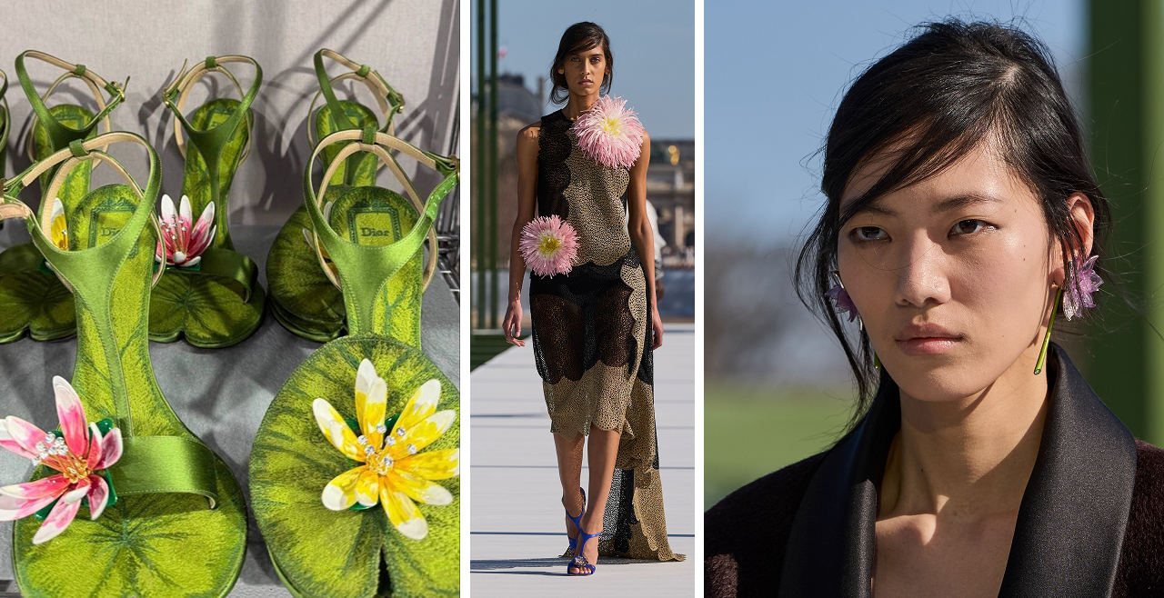 Джонатан Андерсон для Christian Dior зробив квіти центральним мотивом колекції. Тривимірні квіти ніби проростали на мереживних сукнях, водяні лілії декорували босоніжки. У вигляді квітів були також виконані масивні каблучки , а об’ємні квіткові прикраси прикрашали сумки, створюючи флористичний акцент у образах.